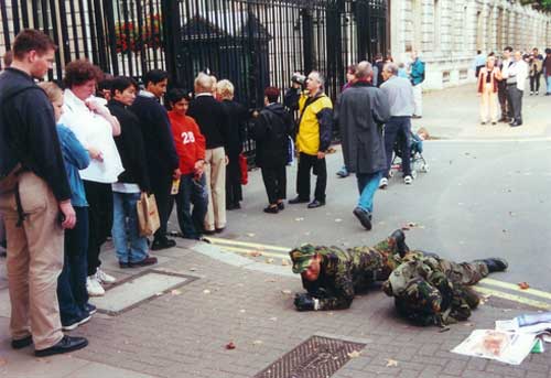 Ignored by some onlookers and creating a palpable sense of unease in others, MAD FOR REAL wore camouflage combat gear and crawled in the mode of combat troops from Trafalgar Square to Waterloo Bridge via Downing Street, Westminster, and the Mall. The progress of the event was transmitted to a radio programme and broadcast.