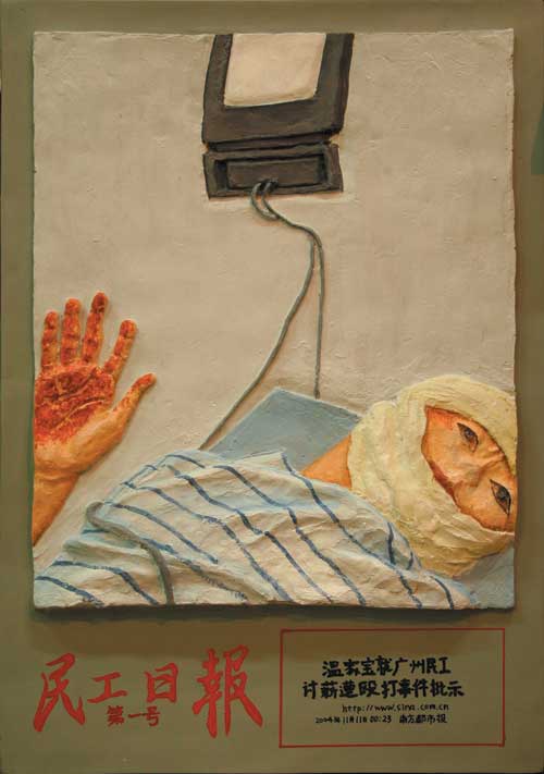 Before mechanized printing, Niahiki-e (Japanese wood block print) was used for making newspapers in Japan, which were called ri ri xin wen 日日新闻 (daily news). Each newspaper was delivered by hand. It goes without saying that the most popular news consisted of the cruelest and most bloodcurdling stories. The artist currently hand-prints a relief sculpture newspaper in China called Migrant Workers' Daily. In a style reminiscent of early Chinese newspapers, Migrant Workers' Daily discusses laborer issues relevant to workers.