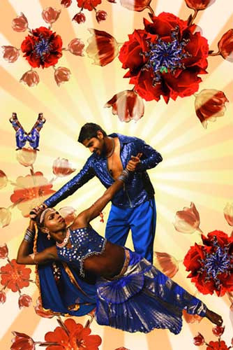 Southern Siren – Maheshwari diverges from the other images by moving away from realism and creating a nowhere space of celebratory camp. A light source behind the ‘hero’, who is positioned in the centre, radiates outward and engulfs both lovers in its glow. The expressions on their faces speak volumes about their relationship and especially, the former’s self-affirmation. Maheshwari’s body may differ significantly from the voluptuous South Indian heroine’s, lanky and muscular as it is, but within the fantastical diegesis of the photograph, that is immaterial. Her lover’s smile is coy but desirous, while her stern, almost aggressive expression seems to say – to the hero and to us – ‘I’m hot and I know it!’ Her position in the photograph, spread as she is in the foreground and overshadowing her lover in adornment, clearly establishes her as the subject of desire. And the caption only reinforces this.
