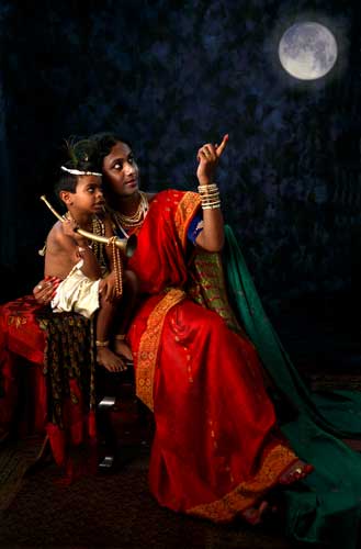 In You too can touch the moon – Yashoda with Krishna, a mother and child pose in a photographic studio for a portrait. A painted backdrop showing the moon completes the arc of vision along which your eyes travel, from the child to the mother to her outstretched hand to the moon. The setting is baroque, opulent, and the costumes fittingly so. There is tenderness in the mother’s demeanour: she envelopes her child in a loving embrace. She gestures to him that the moon, ephemeral and ungraspable as it is, can be reached. He is engrossed in the present, as children are wont to be.