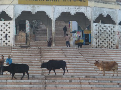 Not in Aurangabad or Agra or Varanasi or any of the cities we visited, though. The cows were just there, and no one paid attention to them, and they paid no attention to us or each other. They just walked around, looked at things the way humans do, nibbled a little alfalfa if anyone offered some, and lay down in the street when it was time to rest. At night, they walked home to their stables; often I’d see a cow heading home at eleven p.m. like a guy leaving a pub, weaving in and out among the merrymakers. It was like living in a cartoon where the different species didn’t seem to know they were different and didn’t care.