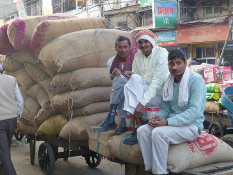 The day we arrived, we battled for a place in New Delhi streets filled with rickshaws, scooters, vendors of every kind, monkeys, and schoolchildren who mocked us roundly. A group of men wrangled two flocks of pigeons in a clear blue sky, calling them with whoops and cries as they laid their bets We muscled our way to a Sikh temple and the spice market, where we felt silly as we coughed and sneezed until we realized the spice sellers, too, were coughing and sneezing—everybody coughed and sneezed except a dog who was sleeping on a sack of peppers.